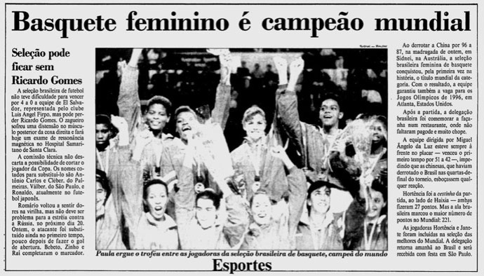 Manchete de jornal da época, após a conquista do histórico título do basquete brasileiro, em 1994. FOTO: Reprodução