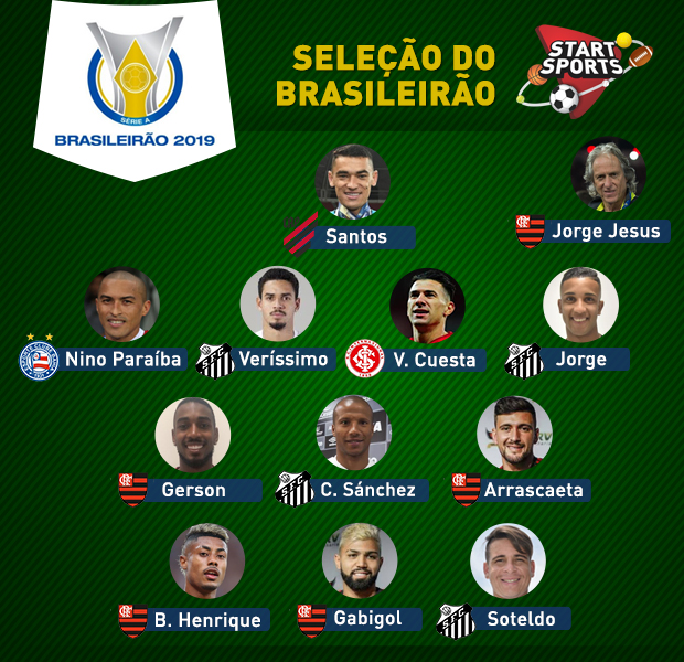 Não teve nenhuma surpresa. Gabigol e Bruno Henrique confirmaram as expectativas e foram os mais escalados ao longo das rodadas. Vale citar que o Michael do Goiás também apareceu 7 vezes, mas no desempate pelo número de gols ficou de fora. Naturalmente, merece ser citado como a revelação do campeonato.