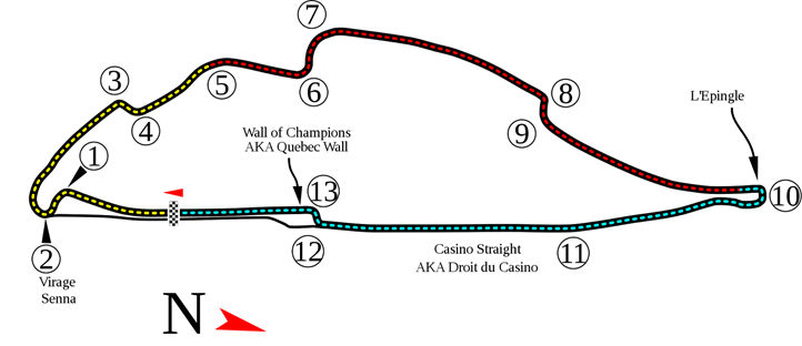 Uma curiosidade do circuito canadense (composto por 13 curvas e algumas retas, nos seus 4361 metros) é que o mesmo possui um lago em seu interior e o mesmo fica em uma ilha. Bom, pelo menos nenhum carro já foi parar dentro do lago ao longo destes anos. Em situações normais, os pilotos deverão fazer este traçado por 70 vezes para que se, conheça o vencedor da etapa canadense da Fórmula 1.O traçado do circuito, pode ser visto na figura a seguir.