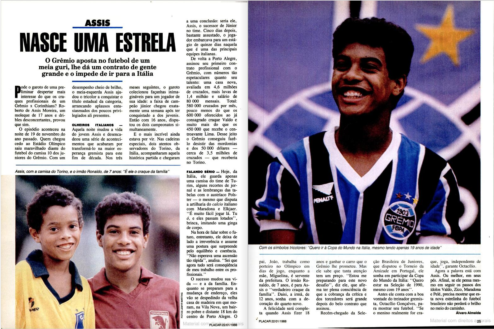 A matéria “Nasce uma estrela” (não sou capaz de dizer se o título era por conta do filme), assinada por Álvaro Almeida na edição da revista Placar de janeiro de 1988, entrevistou a grande promessa do Grêmio naquele ano: Roberto de Assis Pereira, o Assis. A reportagem basicamente destaca a fama que o jovem vinha construindo na base do tricolor gaúcho, o assédio que havia sofrido por parte do Torino da Itália – que o queria para o lugar de Júnior – e o esforço da diretoria gremista para mantê-lo no Brasil, com um novo contrato, uma casa nova e um salário de estrela do time.