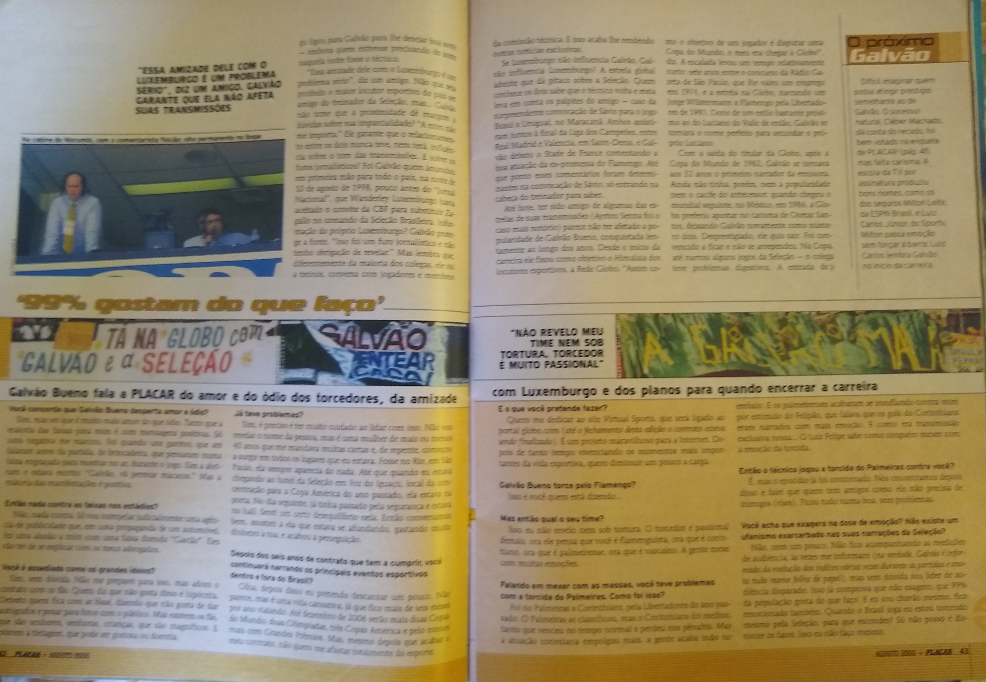 Há vinte anos, a matéria “A voz do futebol”, assinada pela dupla André Fontenelle e Marcelo Costa, na edição da Placar de agosto de 2000, trazia uma entrevista com Galvão no seu auge. O narrador fazia um balanço da carreira até ali, falando de planos para o futuro e de suas amizades no meio esportivo (como a que conservou com Ayrton Senna e a proximidade com o então técnico da Seleção Brasileira Vanderlei Luxemburgo). Além disso falava sobre sua relação com fãs e com o já conhecido “amor e ódio” que gera no seu público.