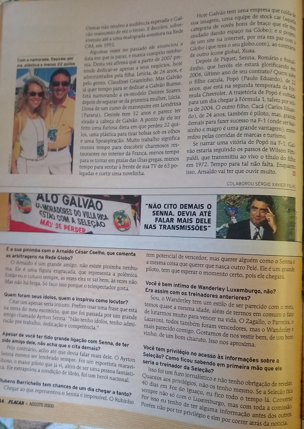 A matéria também trazia diversos aspectos da vida pessoal do narrador como a paixão pelos carros, suas aparentes futilidades e seu lado familiar, desde os relacionamentos com os filhos até a então nova namorada, sua atual esposa, Derisée Soares. E claro, a amizade de longa data com Arnaldo Cezar Coelho foi destaque – talvez uma das mais famosas da TV brasileira. Detalhes dos bastidores das transmissões como as “brigas estratégicas” e as exigências e “chatices” de Galvão com a equipe… Excentricidades de uma estrela, como a matéria mostrou que Galvão era.