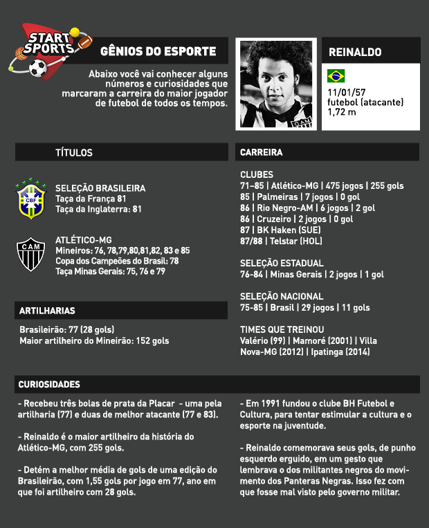 “O Reinaldo era absolutamente um gênio, um jogador extraordinário capaz de se desvencilhar da marcação em um espaço muito pequeno. Todo dia fazia coisas muito diferentes e jogadas geniais” – Marcelo Oliveira, Ex-Jogador do Atlético-MG e técnico