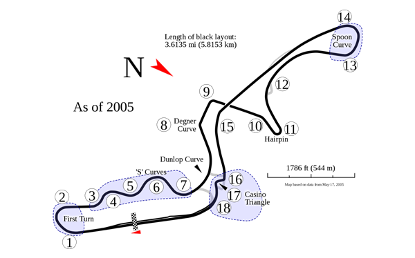 Em situações normais, os pilotos deverão fazer este traçado por 53 vezes para que se, conheça o vencedor da etapa japonesa da Fórmula 1.O traçado do circuito, pode ser visto na figura a seguir.
