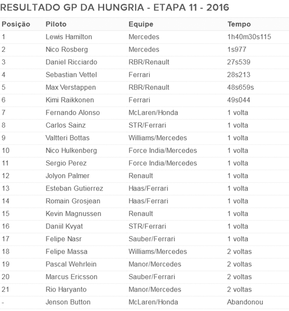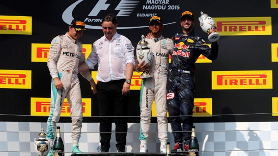 Em uma corrida marcada por poucas ultrapassagens, mas muitas disputas por posição, Lewis Hamilton (Mercedes) conseguiu dois feitos: se tornar de forma isolada o maior vencedor de GP’s da Hungria com 5 vitórias e assumir a liderança no Mundial de Pilotos de 2016 com o triunfo obtido em Hungaroring. O agora vice líder Nico Rosberg (Mercedes) ficou em segundo e Daniel Ricciardo (Red Bull) completou o pódio em terceiro.