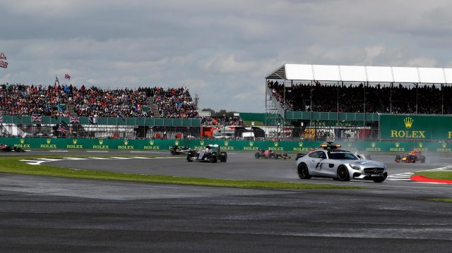 1/52 – A pancada de chuva foi forte, mas rápida e parou pouco antes da hora marcada para a largada.O asfalto, porém, estava muito molhado e a corrida precisou ser iniciada sob Safety Car. Todos os pilotos optaram por começar com pneus de chuva extrema (faixa azul). O spray criado com a passagem dos carros era tão forte que Hamilton, devido a pouca visibilidade, quase bateu no carro de segurança. Só que a pista foi secando, e alguns já cogitavam colocar compostos intermediários (faixa verde). No entanto, eles só poderiam entrar nos boxes na volta que o Safety Car saísse da pista.
