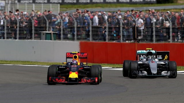 16/52 – Lá na frente, Verstappen mostrou arrojo, aproveitou um erro de Rosberg e colocou por fora do alemão da Mercedes na curva Becketts, tomando a segunda colocação.