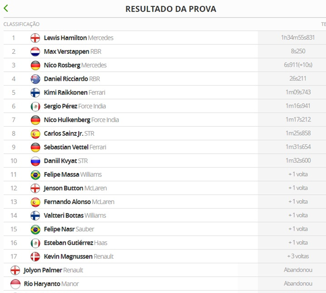 52/52 – Na última volta, a torcida aplaudia de pé Lewis Hamilton, que contornava na ponta dos dedos para vencer a corrida. Rosberg cruzou à frente de Verstappen, mas foi punido horas depois. Ricciardo, Raikkonen, Pérez e Hulkenberg vieram na sequência. Completaram o top 10: Sainz, Vettel e Kvyat. Já Felipe Massa ficou fora da zona de pontuação, em 11º, à frente de Bottas, ao menos. Nasr terminou em 15º.
