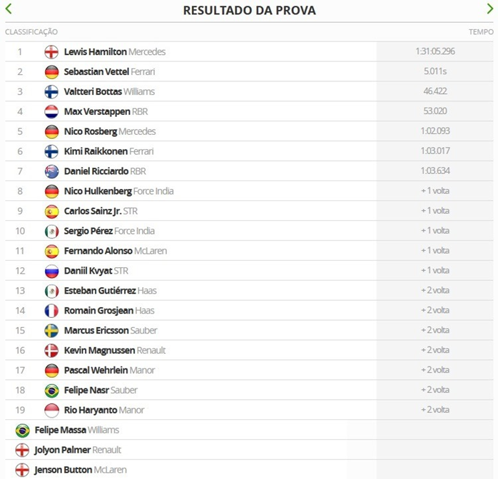 70/70: Lá na frente, Hamilton cruzou a linha de chegada com 5s de vantagem para Vettel. Bottas completou o pódio 45 atrás do britânico.
