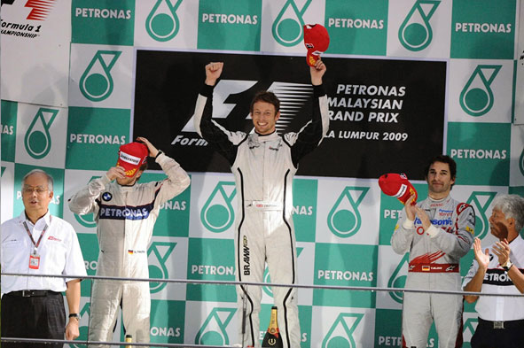 Com isso, o inglês da Brawn GP assegurou a segunda vitória consecutiva na temporada, mas só levou cinco pontos para casa. Nick Heidfeld, da BMW Sauber, acertou na tática e com um pit stop, terminou na segunda posição. Timo Glock, da Toyota, que fez boas apostas nas trocas de pneus, primeiro para o intermediário e depois, de chuva, completou o pódio malaio.” (texto retirado do site globoesporte.com).