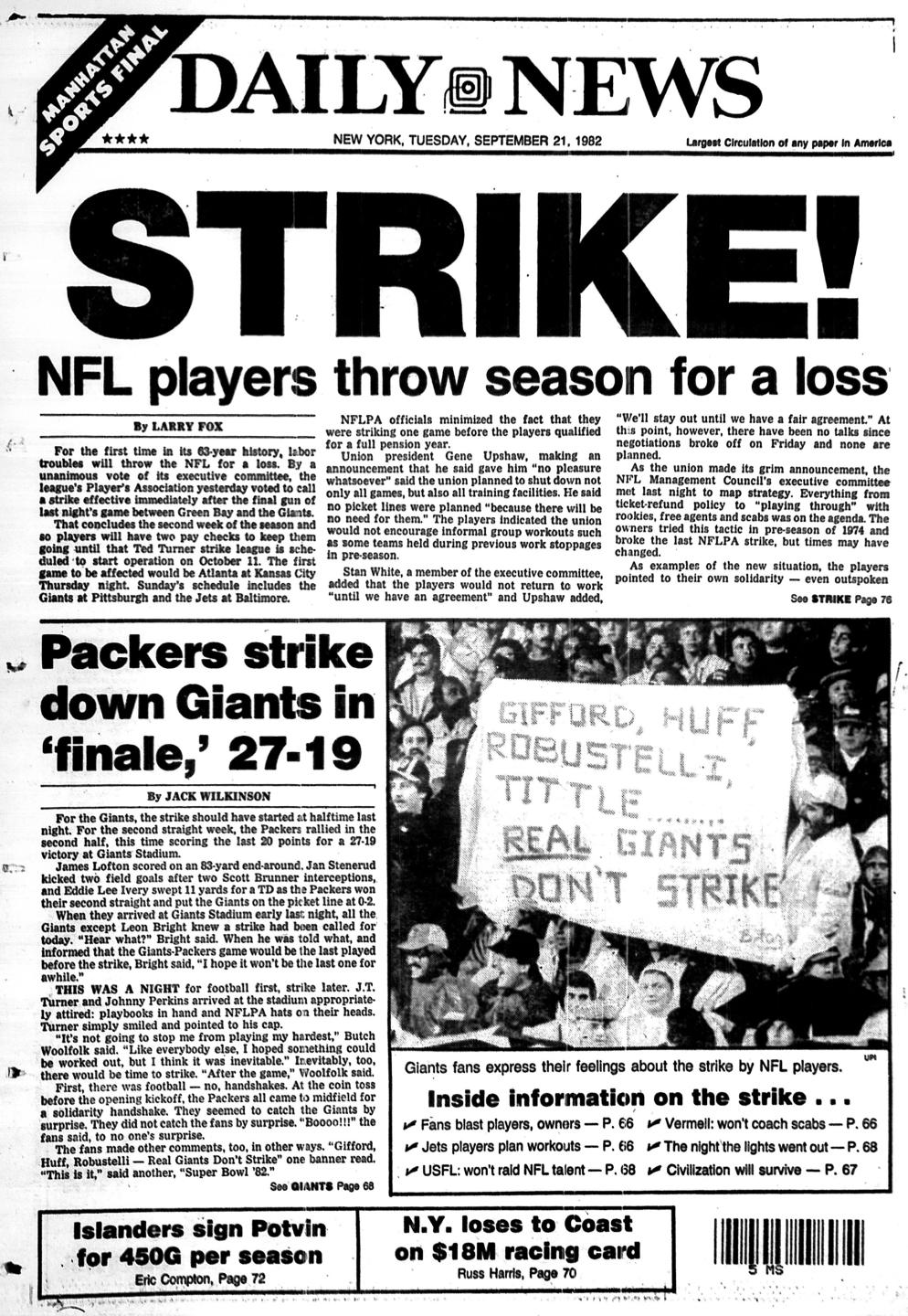 As negociação seguiram e a temporada começou. Duas semanas de jogos e nenhum acordo firmado. Assim, à meia-noite do dia 20 de setembro de 1982, após o Monday Night entre New York Giants e Green Bay Packers, a greve começou.