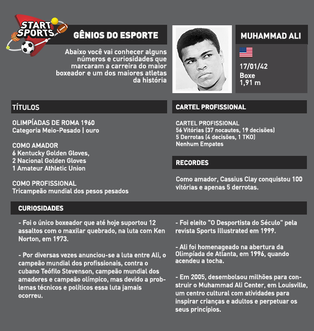 Ele voava como uma borboleta e picava como uma abelha. Era assim que Ali se definia e assim construiu sua carreira, que transcendeu o esporte e ganhou a história. Nascido Cassius Marcellus Clay Jr., em Louisville, no Kentucky, foi uma figura gigante para o esporte e ainda maior para a sociedade do seu tempo.