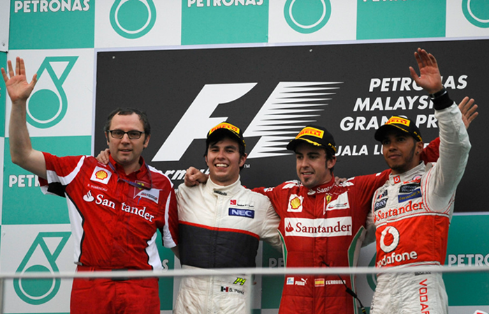 Alonso fazia uma sequência de voltas mais rápidas, até que a pista começou a secar e Pérez passou a ser o mais rápido e a diferença entre eles caiu drasticamente. A cinco voltas para o fim, a diferença entre os dois era de menos de dois segundos e Pérez tinha a chance de conquistar a primeira vitória da equipe Sauber. Entretanto, perto do fim, ele errou, saiu da pista e Alonso abriu vantagem novamente. O piloto espanhol recebeu a bandeira quadriculada logo em seguida. Perez terminou em segundo e Hamilton em terceiro.”