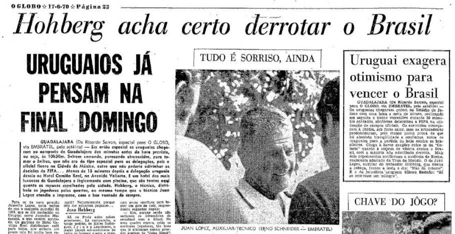 Agora, que o Uruguai se apegou a isso… Ah, com certeza. Eles não eram bobos de deixar passar. Nas coletivas pré-jogo, estavam presentes o auxiliar técnico Juan López, o “Juancito Maracanã” – que esteve na equipe campeã de 1950, e o técnico Juan Hohberg. Esse causou… “Itália e Alemanha que resolvem entre eles quem sobrará para enfrentar domingo o Uruguai, pois nós iremos à final”, disse o diretor técnico uruguaio, garantindo a capa dos periódicos brasileiros. Sem falar nos jornais uruguaios. Um deles até estampou a manchete “Uruguay 30 – 50 – 70″, em referência aos títulos de 30 e 50, já projetando o de 70.