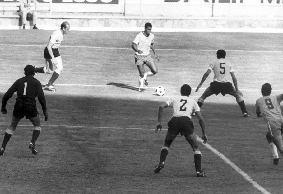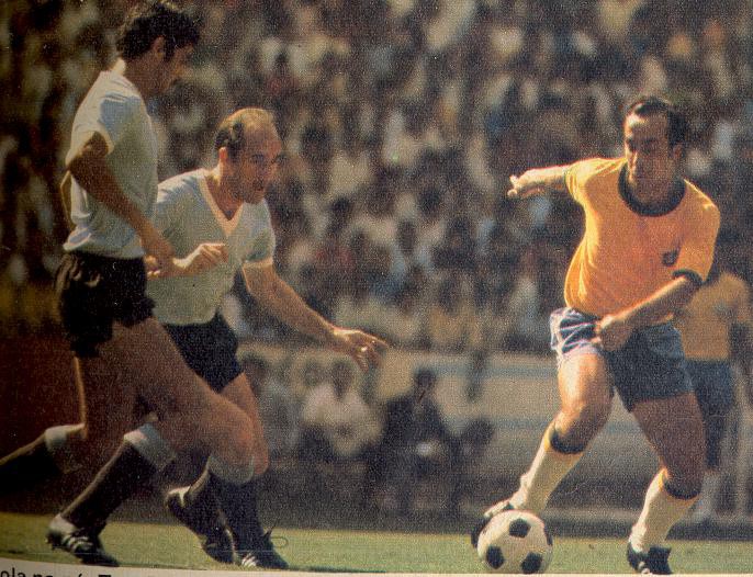 O Rei seguia ligado. Jairzinho escapou de duas pancadas… quer dizer, marcadores, e rolou para Pelé chutar com violência para fora, raspando a trave. O Brasil começou a criar muito pelas pontas, com Rivellino e, principalmente, com Jairzinho. E o Uruguai começou a falhar…