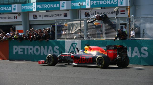 Em uma corrida movimentada, com direito a mais uma acidente logo na largada, belas ultrapassagens e o motor de Lewis Hamilton (Mercedes) ter estourado no meio da corrida, Daniel Ricciardo (Red Bull), voltou a vencer após dois anos uma corrida de Fórmula 1. Pela primeira vez o australiano venceu o GP da Malásia e, além disso, trinfou no duelo particular com seu companheiro de equipe Max Verstappen (Red Bull) que chegou em segundo, configurando a primeira dobradinha do time austríaco em 2016.
