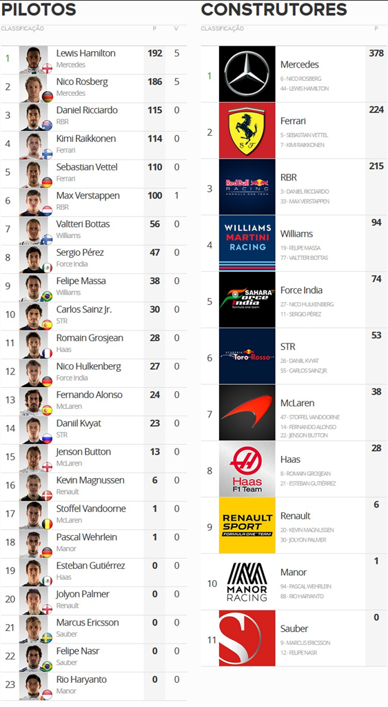 12/56 – Hamilton liderava a prova, seguido por Ricciardo e Raikkonen. Dos oito primeiros colocados, apenas Verstappen, em quarto, já havia parado nos boxes. O holandês estava a 17s do britânico da Mercedes. Nasr aparecia em 12º, e Massa em 19º.