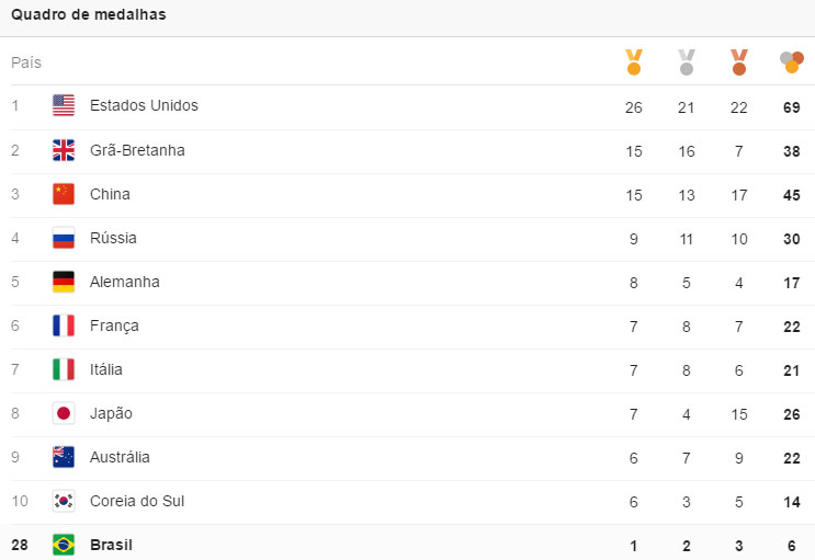 Para encerrar o resumo do dia, segue o quadro de medalhas.
