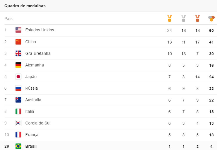 Para encerrar, o quadro de medalhas e arrancada dos EUA na liderança.