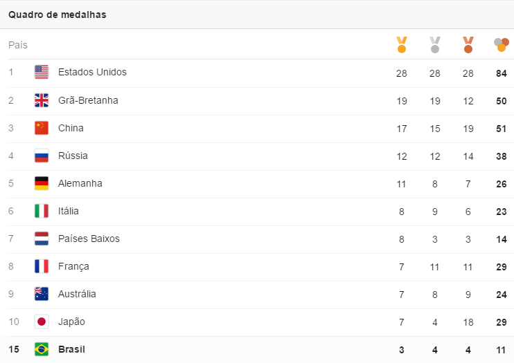 Confira o quadro de medalhas: