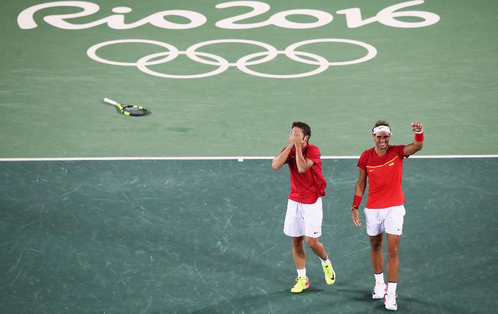 No tênis, o nome do dia foi o genial Rafael Nadal. Primeiro ele foi para a quadra encarar Thomaz Bellucci e a torcida brasileira. Começou mal, foi dominado pelo brasileiro mas mostrou sua força de reação e virou para 2 sets a 1, garantindo vaga nas semifinais de simples, ao lado do britânico Andy Murray, do japonês Kei Nishikori e do argentino Juan Martin Del Potro. Horas depois, lá estava o “Touro Miúra” para disputar a final de duplas masculinas, ao lado de seu parceiro Marc Lopez. Após 2h26 de muito equilíbrio, os espanhóis superaram os romenos Florin Mergea e Horia Tecau – algozes de Bruno Soares e Marcelo Melo – por 2 sets a 1 (6/2, 3/6 e 6/4). O bronze ficou com os americanos J. Stock e S. Johnson. Depois do espetáculo, Nadal foi ovacionado pelo público na quadra.