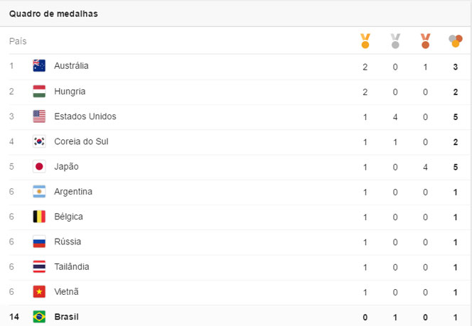 A natação já começou a mil! A húngara Katinka Hosszú bateu o recorde mundial dos 400m medley, com 4m 26s 36, deixando Madeleine Dirado, dos EUA, com a prata e a espanhola, Mirela Belmonte, com o bronze. Na prova masculina, ouro para o Japão, com Kosuke Hagino, prata para os EUA, com Chase Kalisz, e bronze também para o Japão, com Daiya Sato. No finzinho da noite, a Austrália venceu duas provas e assumiu a liderança do quadro de medalhas. O revezamento 4x100m da Austrália encerrou a noite de sábado com uma nova marca na história: 3m30s65. Deixou a prata com os EUA e o bronze com Canadá. A outro ouro australiano veio no 400m livre masculino, com Mark Horton, que superou Sun Yang (China) e Gabriele Deti (Itália).