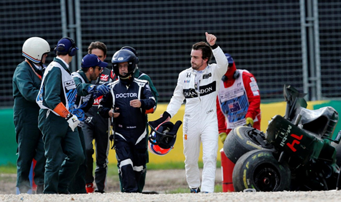 Na 18ª volta, Fernando Alonso levou um susto daqueles. O espanhol tocou traseira na Haas de Esteban Gutiérrez durante uma tentativa de ultrapassagem e decolou. O carro de Alonso bateu no muro lateral, capotou e foi parar na barreira de pneus do outro lado da brita da curva 3 do Circuito de Albert Park. A McLaren ficou completamente destruída. Com o carro de cabeça para baixo, o bicampeão mundial precisou rastejar para sair do cockpit. Alonso deixou o carro aparentando sentir dores, mas apesar da imagem impressionante, não sofreu lesões graves. O mexicano Gutiérrez também não se machucou.