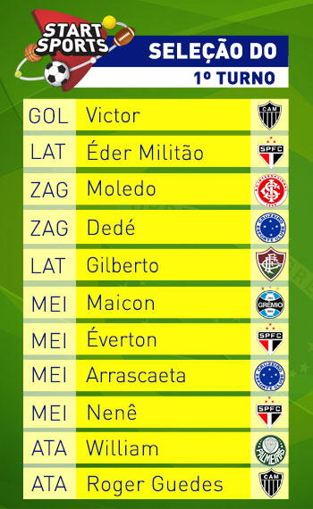 E chegou o fim do primeiro turno. A seleção da rodada teve 19 edições e ao fim do turno, resolvemos (como já é tradição) listar a seleção dos mais escalados. O critério é simples: quem foi indicado em mais edições na posição, está eleito. É diferente do que fazemos ao fim do campeonato, quando escolhemos os melhores por meio de critérios técnicos.