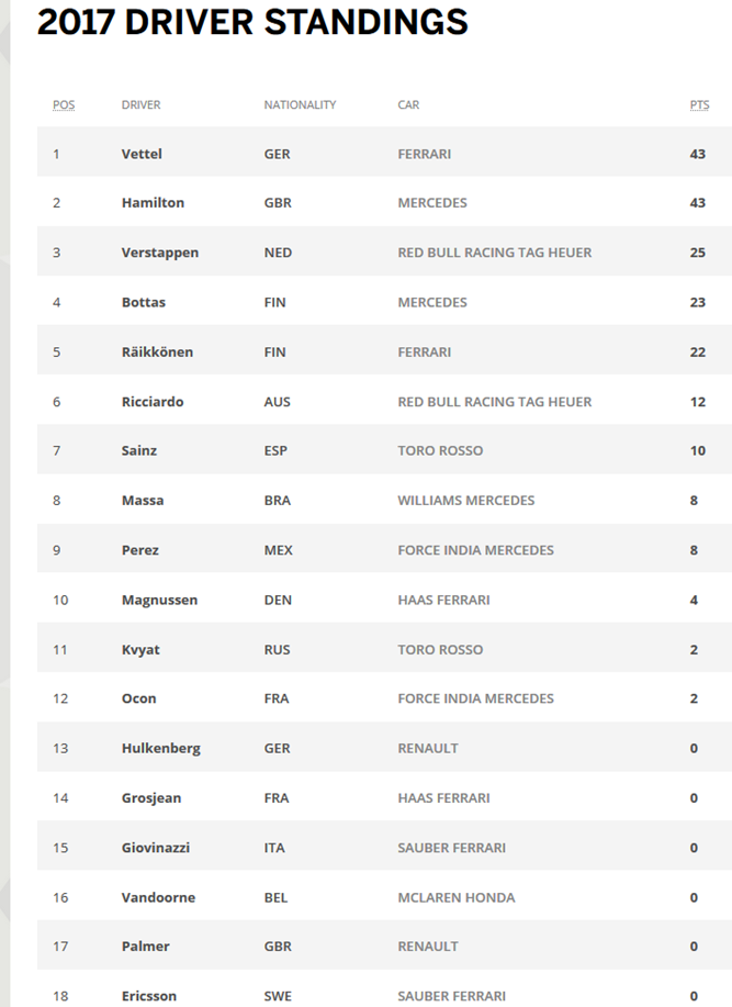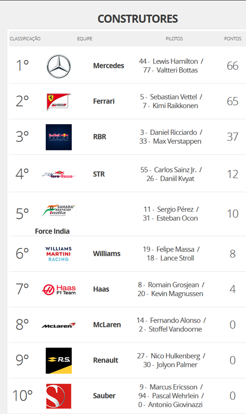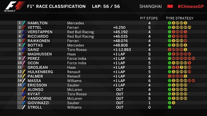 Em uma corrida que começou com a pista úmida e marcada por belas ultrapassagens, Lewis Hamilton (Mercedes) vence o GP da China, deixando desta vez o tetracampeão Sebastian Vettel (Ferrari) em segundo e Max Verstappen (Red Bull), após bela corrida de recuperação, em terceiro lugar. Vettel e Hamilton dividem a liderança do Mundial de Pilotos após as duas primeiras corridas do ano.
