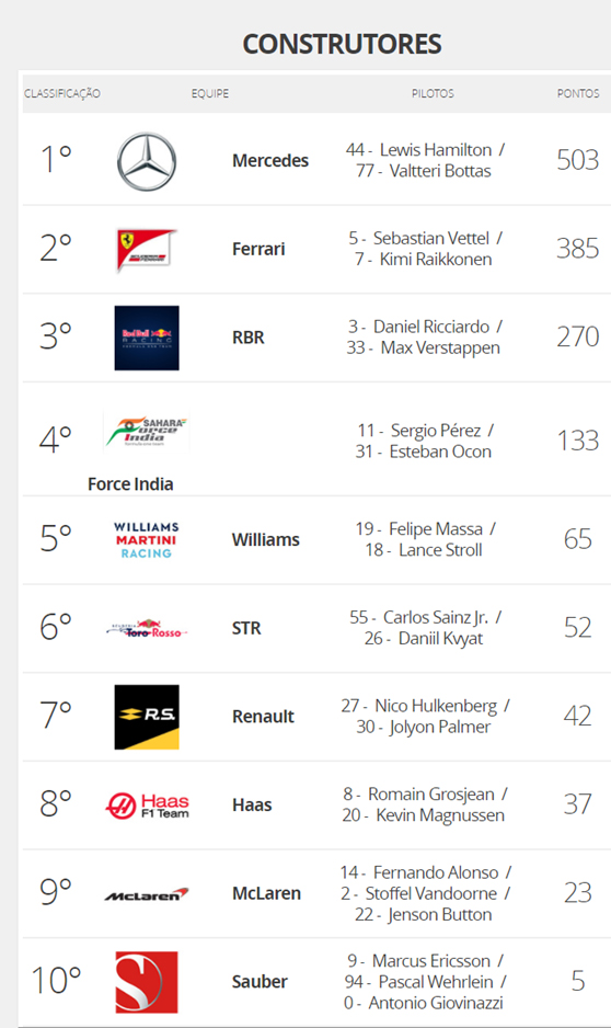 Teve briga boa entre os carros da Williams. Massa defendia a posição contra o novato Lance Stroll, que reclamou do brasileiro no rádio. Mas resolveu mesmo passar na pista, depois de muita luta. Pena que valia a 13ª posição. Outro que chamou atenção na prova foi o francês Ocon, que se envolveu em dois entreveros: primeiro com Sainz Jr. e depois com o próprio Massa.