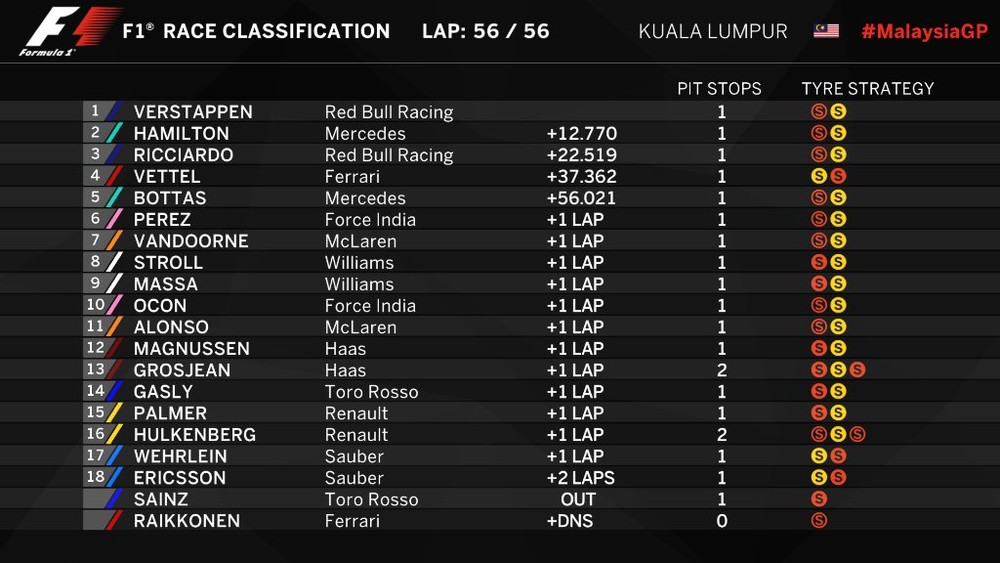Depois de ser ultrapassado por Alonso, Magnussen se atrapalhou com Palmer e os dois quase atingiram Verstappen. Passando por isso, Max recebeu a bandeirada e venceu sua segunda corrida na carreira se tornando assim o mais jovem piloto a obter tal feito – as duas marcas de vitórias mais precoces são dele.