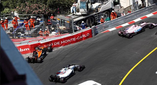 Ao contrário do que costuma acontecer, a largada do GP de Mônaco foi limpa, sem nenhum grande entrevero. Kimi Raikkonen manteve a liderança com tranquilidade, seguido de Sebastian Vettel e Valtteri Bottas. Tentando a ultrapassagem sobre Max Verstappen, Daniel Ricciardo tocou de leve o companheiro de equipe, mas ambos mantiveram suas posições, com o holandês em quarto e o australiano em quinto. Largando da 13ª colocação, Hamilton tracionou melhor e conseguiu a ultrapassagem sobre Stoffel Vandoorne. Felipe Massa manteve o 14º lugar. Voltando à F1, Jenson Button saiu dos boxes em último.
