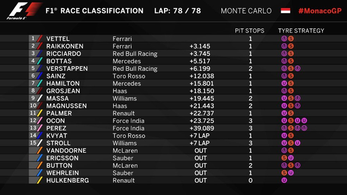 Em uma corrida movimentada somente nas últimas 20 voltas, Sebastian Vettel (Ferrari) deu uma de Schumacher – superando Kimi Raikkonen (Ferrari) numa parada de pit stop – e venceu o GP de Mônaco pela segunda vez na sua carreira. Com a vitória e o 7º lugar do inglês Lewis Hamilton (Mercedes), Vettel abriu 25 pontos de vantagem na liderança do Mundial de Pilotos. Daniel Ricciardo (Red Bull) completou o pódio. Felipe Massa (Williams) fez uma corrida dentro das possibilidades do seu carro e terminou a corrida em 9º lugar.