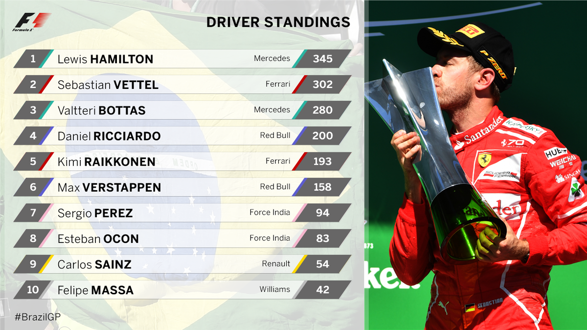 E deu Vettel em Interlagos. Em uma corrida marcada por muitas ultrapassagens, o alemão da Ferrari venceu o GP do Brasil e praticamente confirmou o vice-campeonato da temporada 2017 de Fórmula 1. Depois de perder o título para Hamilton, Sebastian se manteve à frente de seu concorrente na disputa pelo vice, Valtteri Bottas (Mercedes), que terminou o GP em segundo, com Kimi Raikkonen (Ferrari) em terceiro.